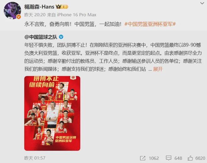 目前杨瀚森已经结束休假回归了开拓者,自8月11日起参加联盟与球队组织的训练营,近日他在忙里偷闲之中祝贺中国男篮夺得今年亚洲杯的亚军。
