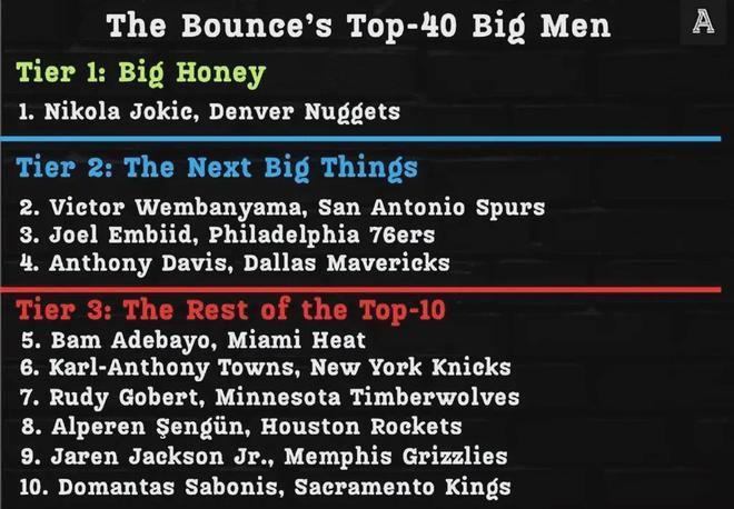 美媒《TA》专家Harper公布了新赛季40大中锋的排名,前十分别是约基奇、文班亚马、恩比德、浓眉哥、阿德巴约、唐斯、戈贝尔、申京、小贾伦-杰克逊和萨博尼斯。