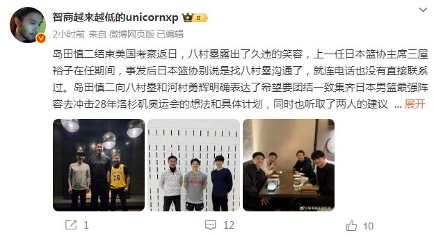 “岛田慎二向八村塁和河村勇辉明确表达,希望要团结一致集齐日本男篮最强阵容,去冲击28年洛杉矶奥运会的想法和具体计划,同时也听取两人的建议和想法。”